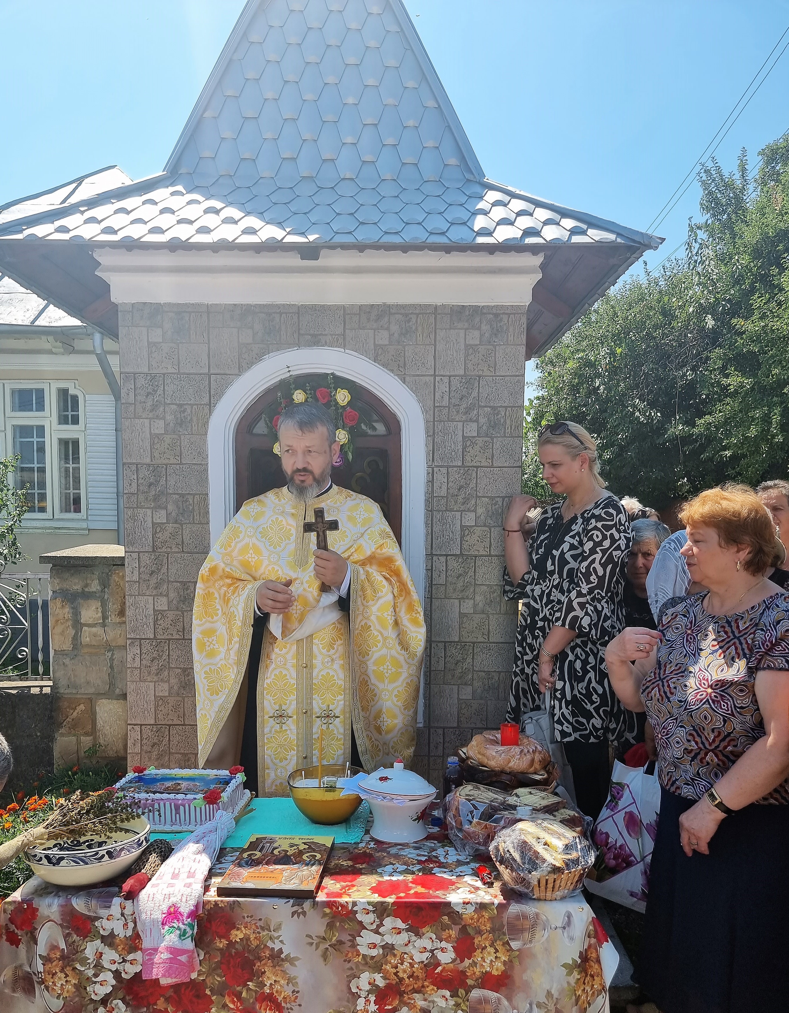 Troița este o mărturisire concretă într-un spațiu al recunoștinței. Spațiul recunoștinței a făcut posibilă prezența acestei troițe și iată cum! Troița pleacă de la o sfântă icoană adusă la biserică pentru sfințire, icoana unui sfânt, a Maicii Domnului sau a Domnului nostru Iisus Hristos. Ea, fiind sfințită, credinciosul o duce acasă și se roagă ei, către răsărit, cu credință și recunoștință către Bunul Dumnezeu. Iar Dumnezeu îi îndeplinește rugăciunea. Și credinciosul, în această stare de recunoștință, scoate sfânta icoană în drum, pentru a mărturisi celorlalți cât bine i-a făcut Dumnezeu. Ei bine, noi suntem adunați aici datorită credinței noastre în Dumnezeu și datorită evlaviei pe care o avem față de Maica Domnului. Și de aceea îi mulțumim Maicii Domnului pentru prilejul și bucuria pe care ne-a acordat-o astăzi, de a fi împreună, aici, la rugăciune”, a exprimat părintele Munteanu la oficierea slujbei de hram a troiței.