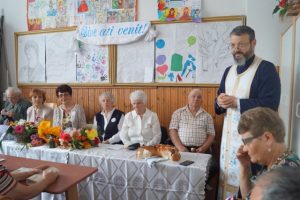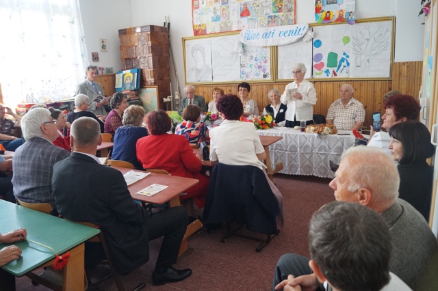 Întâlnirea a fost binecuvântată de preotul Petru Munteanu, care în același timp a dorit să le adreseze câteva cuvinte: „Suntem în Școala Veche, aici, unde dumneavoastră ați petrecut cea mai frumoasă perioadă, pentru că dacă ar fi să dăm firul vieții înapoi am recunoaște că perioada copilărie este cea care ne marchează, este fermentul a ceea ce mai târziu ne va alcătui în viață. Curiozitatea noastră, lucrurile pe care le aflăm de la profesori și de la cei din jur sunt cele care mai târziu ne vor trasa destinul. (…) Să dăm copiilor credința, rugăciunea cea care formează ca într-o țesătură și adună comunitatea noastră. Vă îndemn cu drag și cu respect să dăruiți nepoților dumneavoastră și copiilor, darul cel mai frumos pe care îl poate da un bunic sau o bunică, o rugăciune sau credința în Dumnezeu. Pentru că prin această rugăciune, noi trecem prin noaptea sau furtunile vieții biruitori, în orice fel de încercare am fi. Vă doresc o zi binecuvântată şi să rămânem împreună în această școală, în acest spațiu al amintirilor frumoase şi al tinereţii şi al copilăriei dumneavoastră. Toate cele bune vă doresc! Hristos a înviat!”